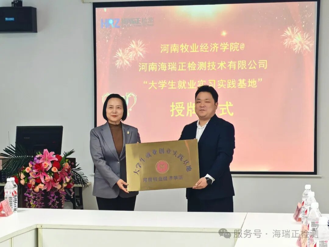 為進(jìn)一步推動(dòng)合作落地,尹新明校長代表學(xué)校向海瑞正檢測授予“大學(xué)生就業(yè)實(shí)習(xí)實(shí)踐基地”和“百名專家助百企工程服務(wù)基地”牌匾。